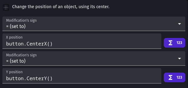 The process for aligning text to other objects is similar. Consider placing a text object on a button. Use the Center position action with X and Y values OBJECT.CenterX() and OBJECT.CenterY() respectively to position the center of your text object over the center of your button object.