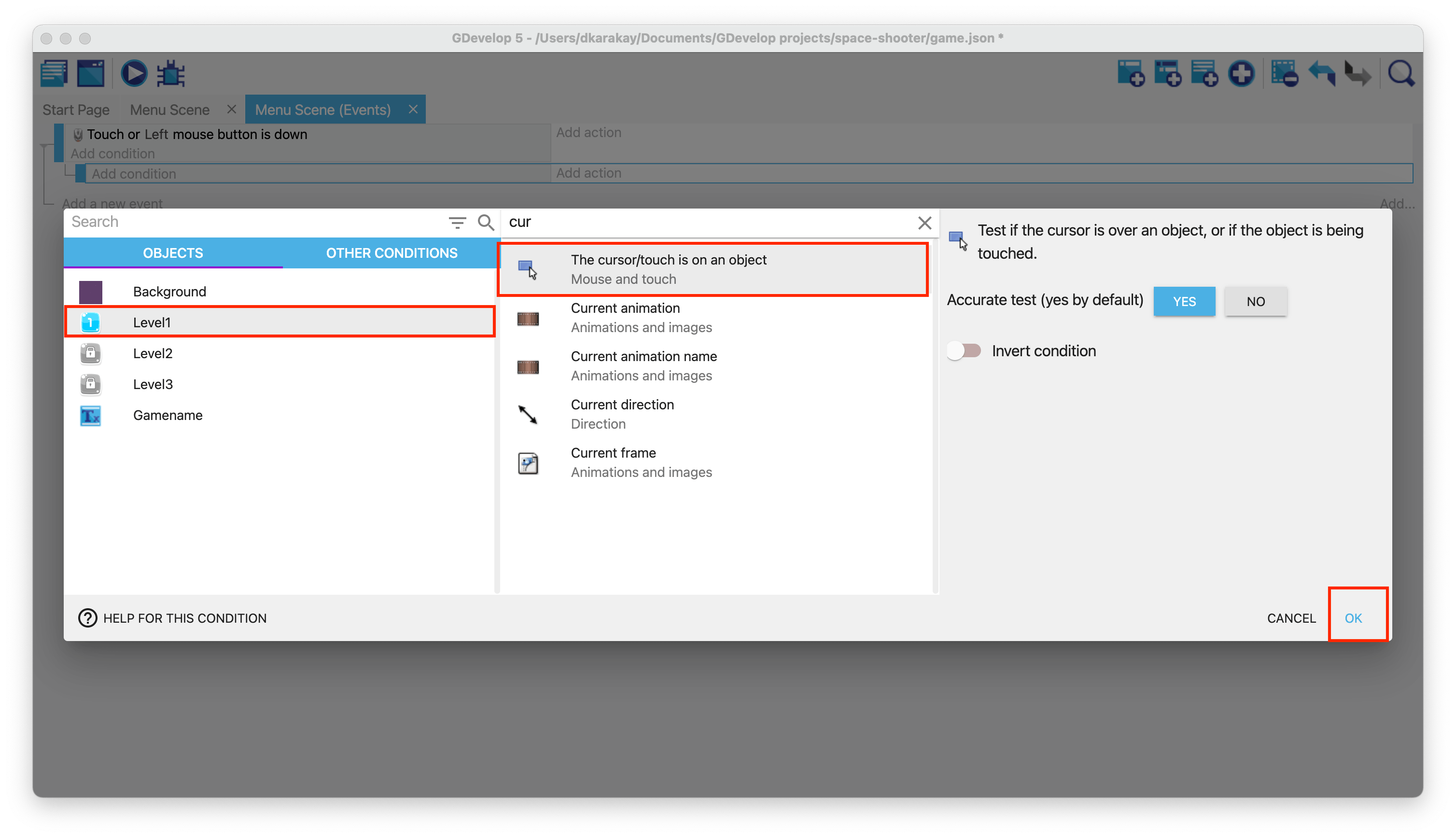 Then, add a sub-event. Choose Level1, and select The cursor/touch is on the object option.